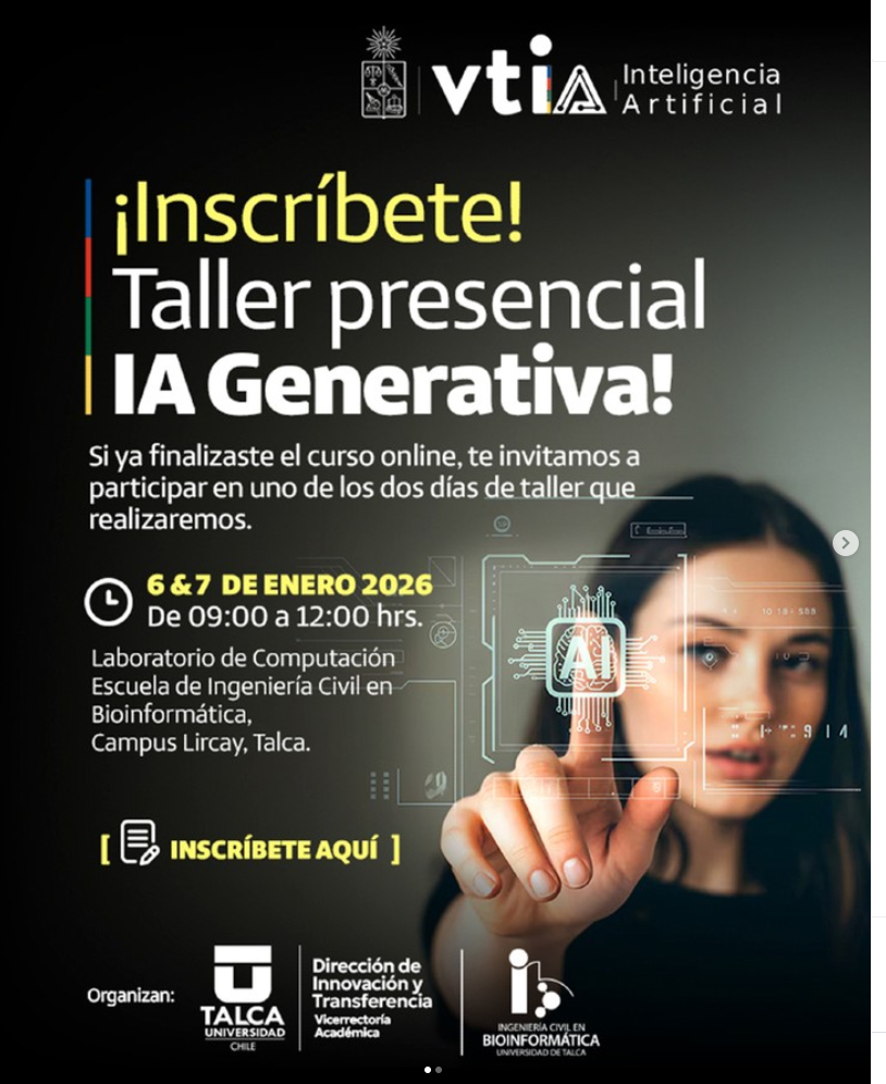 La Dirección de Innovación de la Universidad de Talca, en colaboración con la Universidad de Chile y la Escuela de Ingeniería Civil en Bioinformática, realizó el taller “¡Da el Salto con la IA Generativa!”, una iniciativa formativa orientada a fortalecer capacidades prácticas para comprender, aplicar y aprovechar la inteligencia artificial generativa en contextos reales y transversales.